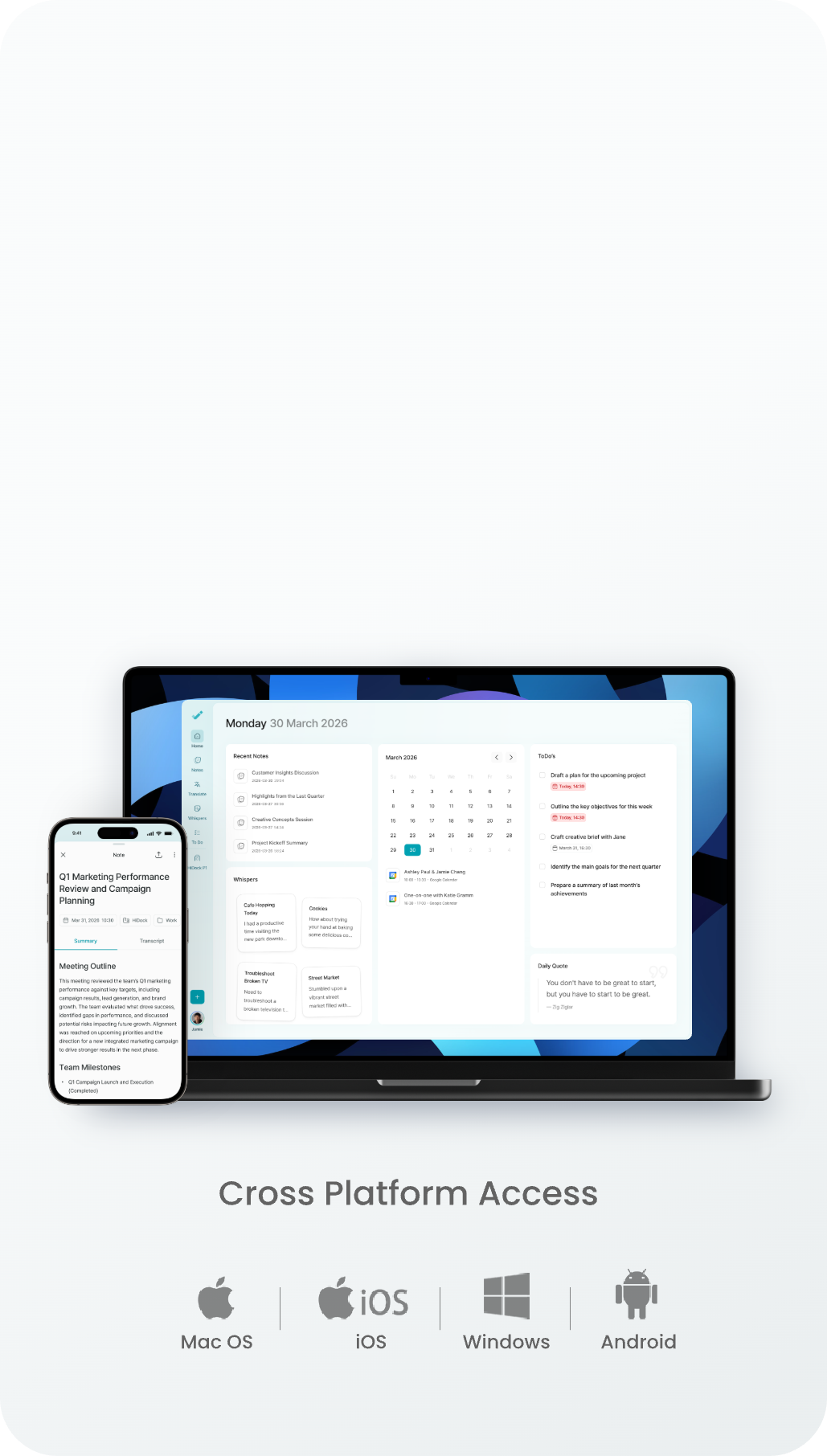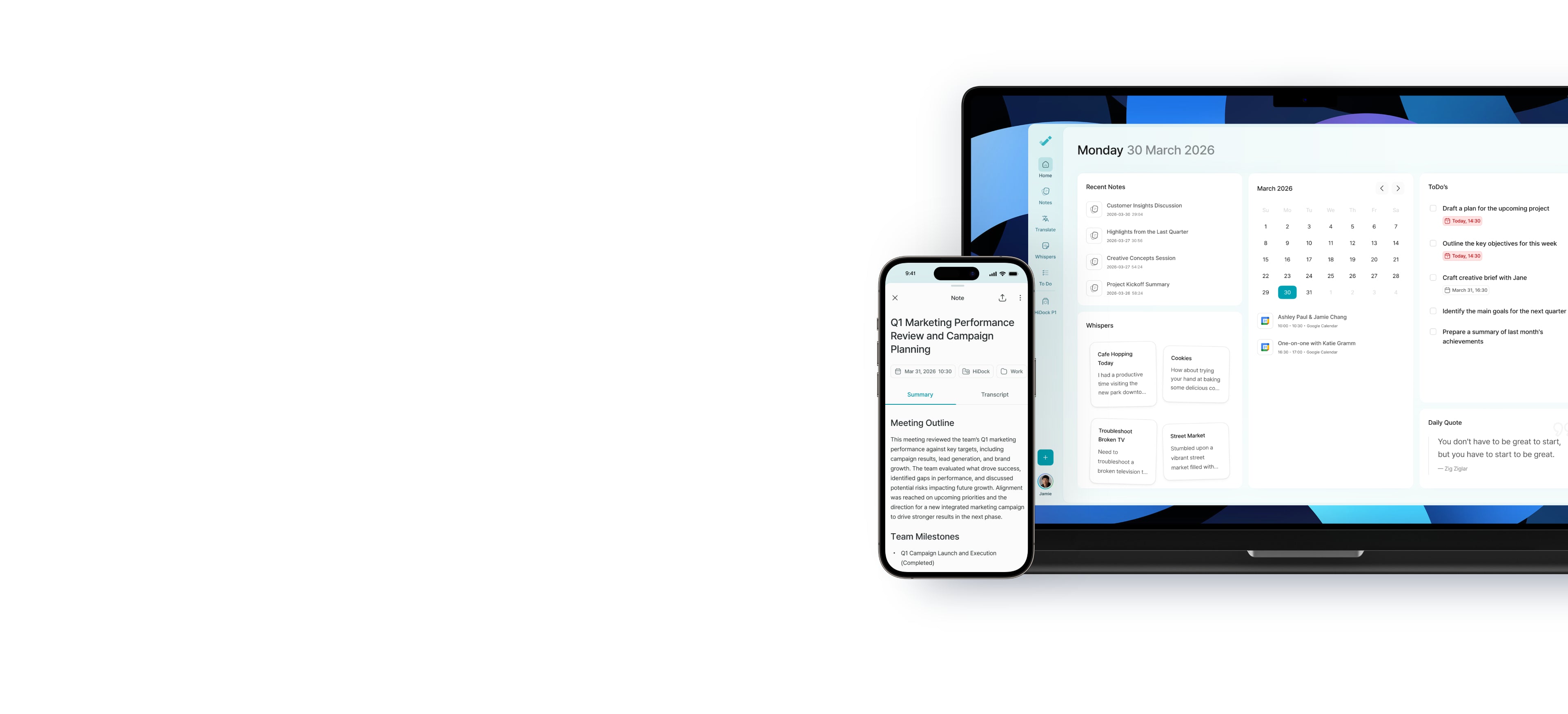 HiNotes, a simple yet powerful voice-to-text app seamlessly integrated with HiDock. Transcribe all your meetings into actionable insights. Never take meeting notes again.