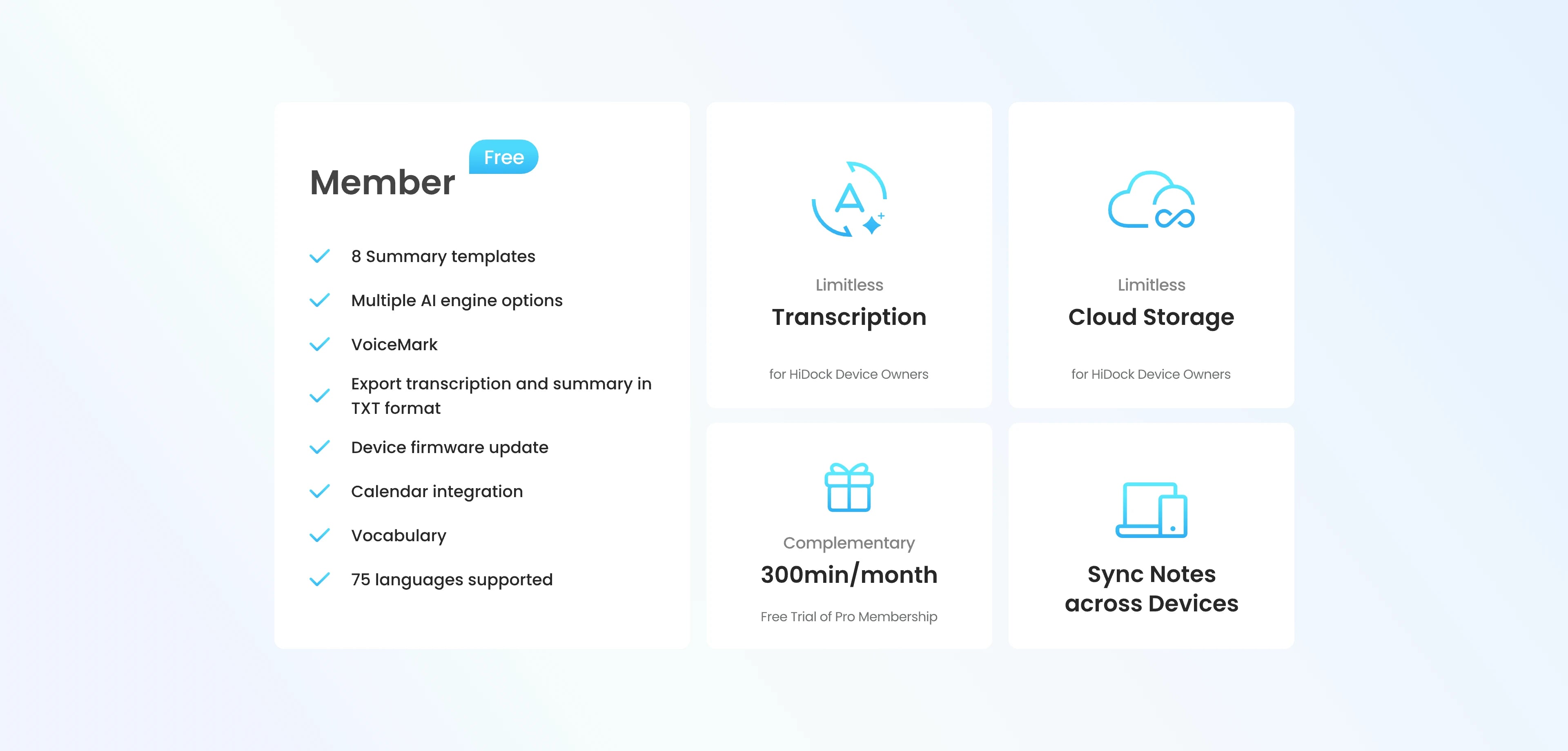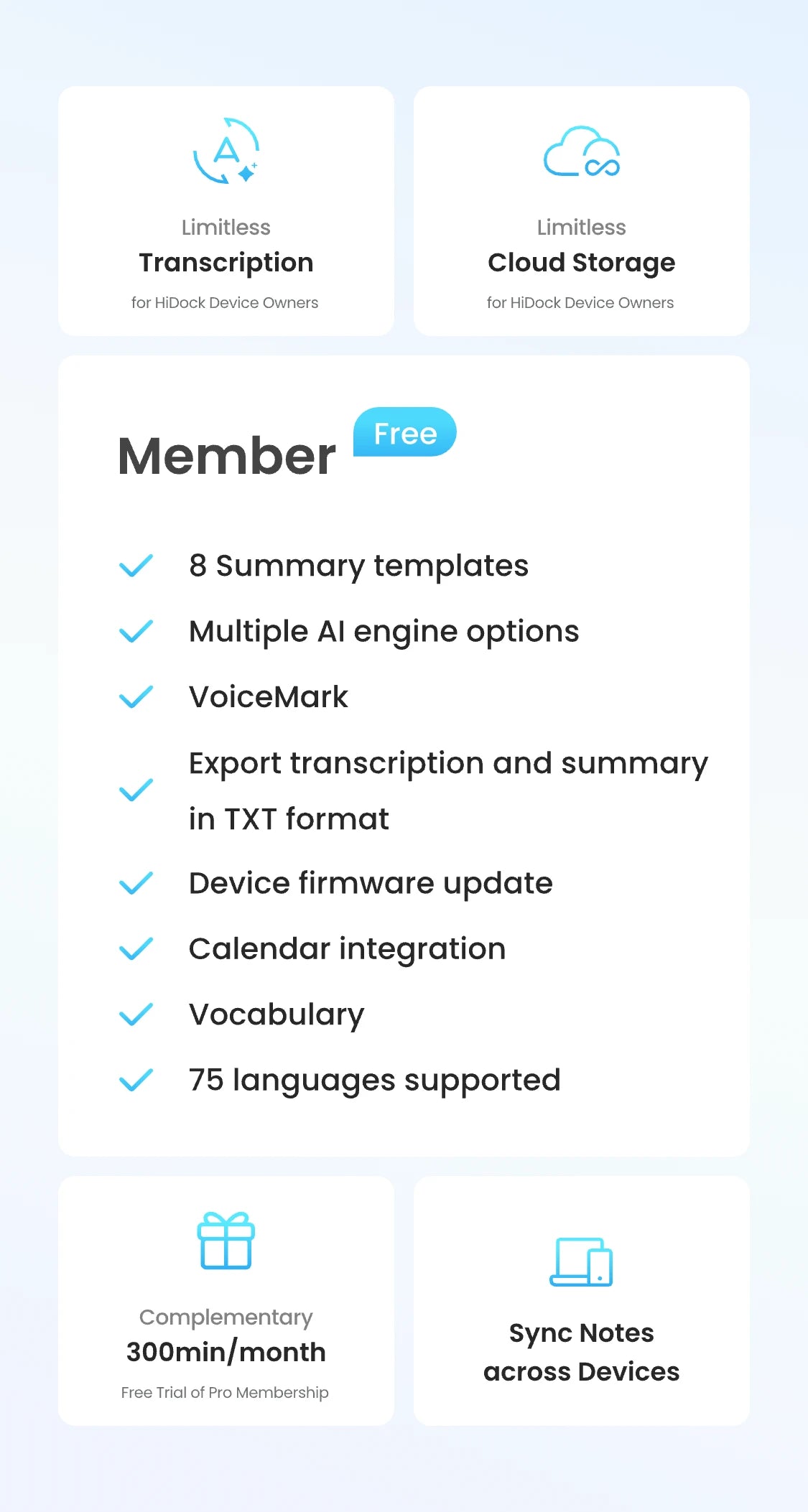 Unlike most competitors that limit free quotas and require subscriptions afterwards, even for essential transcription, HiDock offers unlimited free AI transcription, with advanced features available as optional upgrades when you need them. More freedom, more flexibility.